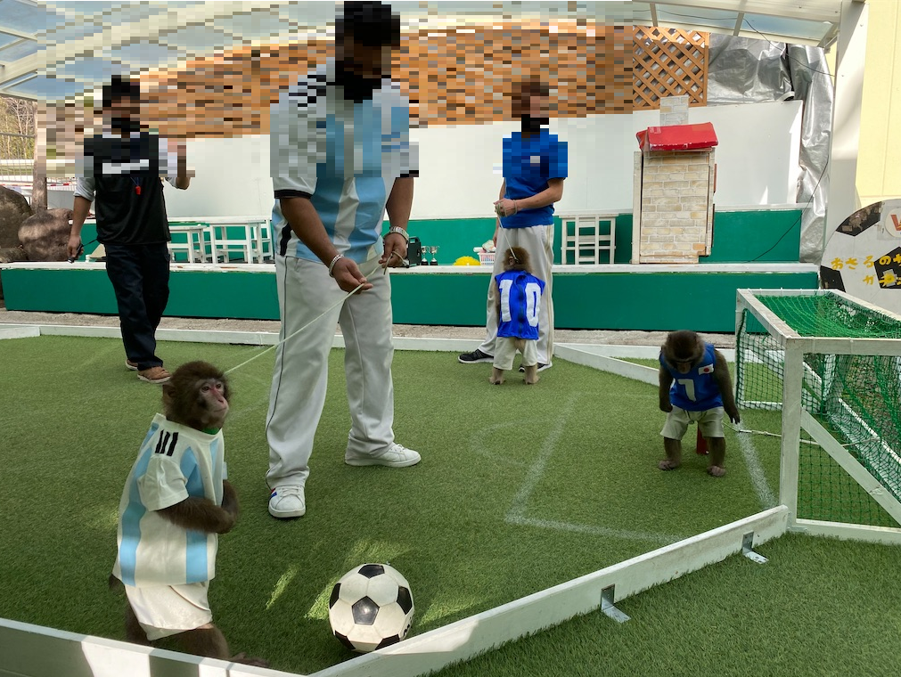 飼育員は、おさるさんにシュートをさせようと必死になっていますが、当のおさるさんは・・・自由に動き回っています!